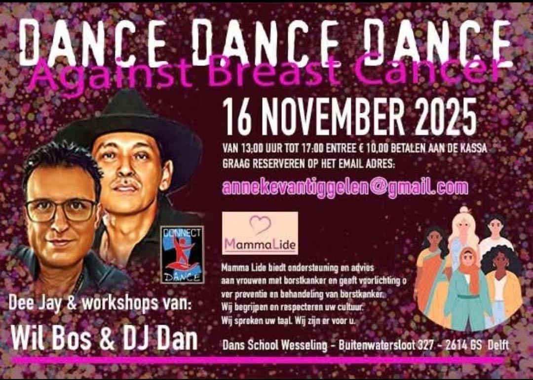 DANCE DANCE DANCE Against Breast Cancer | 16 november 2025 | Dansschool Wesseling / Buitenwatersloot 327 / 2614 GS Delft | Van 13:00 uur tot 17:00 uur / / Entree €10,00 Betalen aan de kassa // Graag reserveren via emailadres annekevantiggelen@gmail.com |